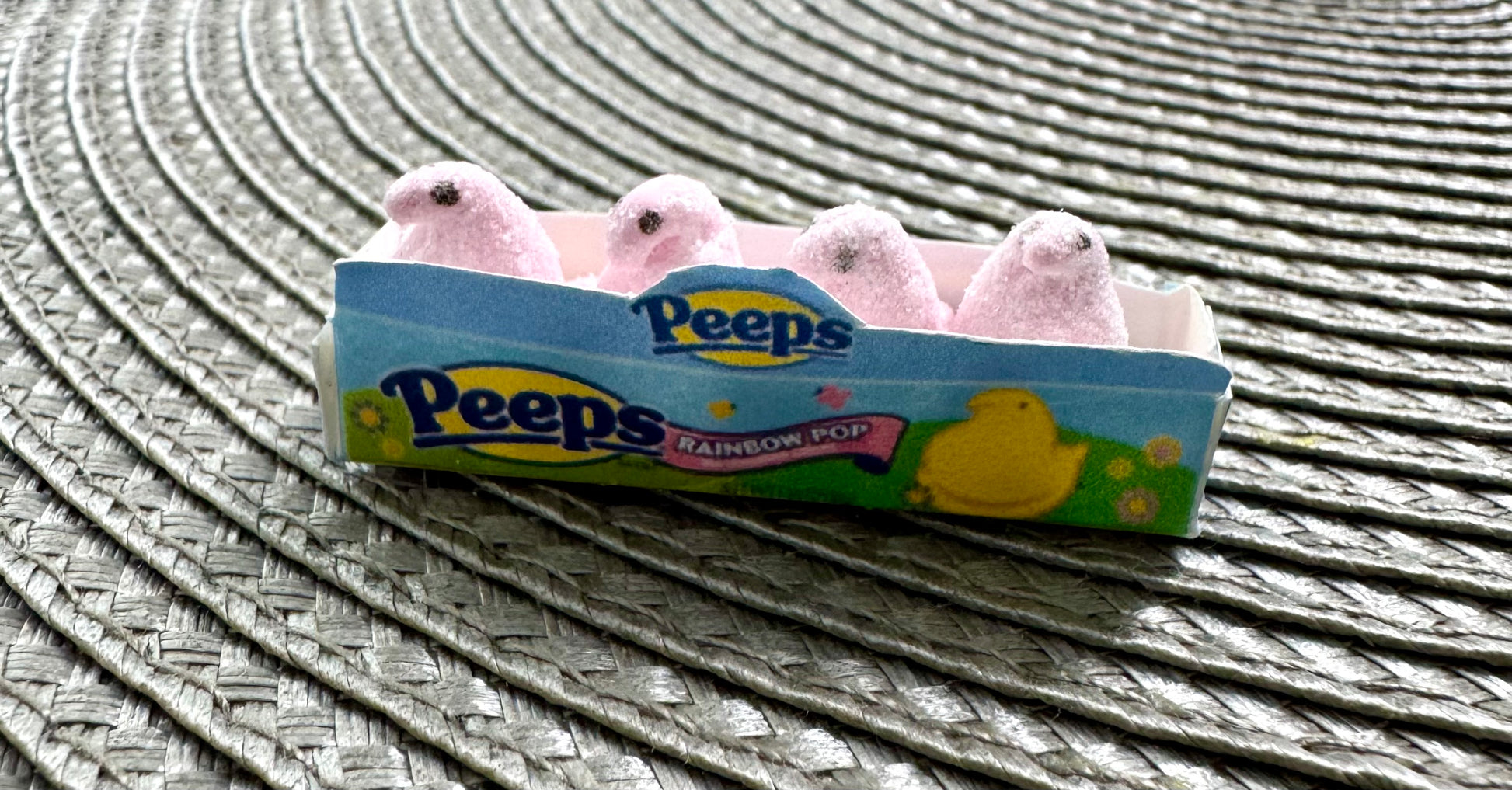 Four handmade candy pink sugar chicks in a box ready to use as a table or basket display for your doll.