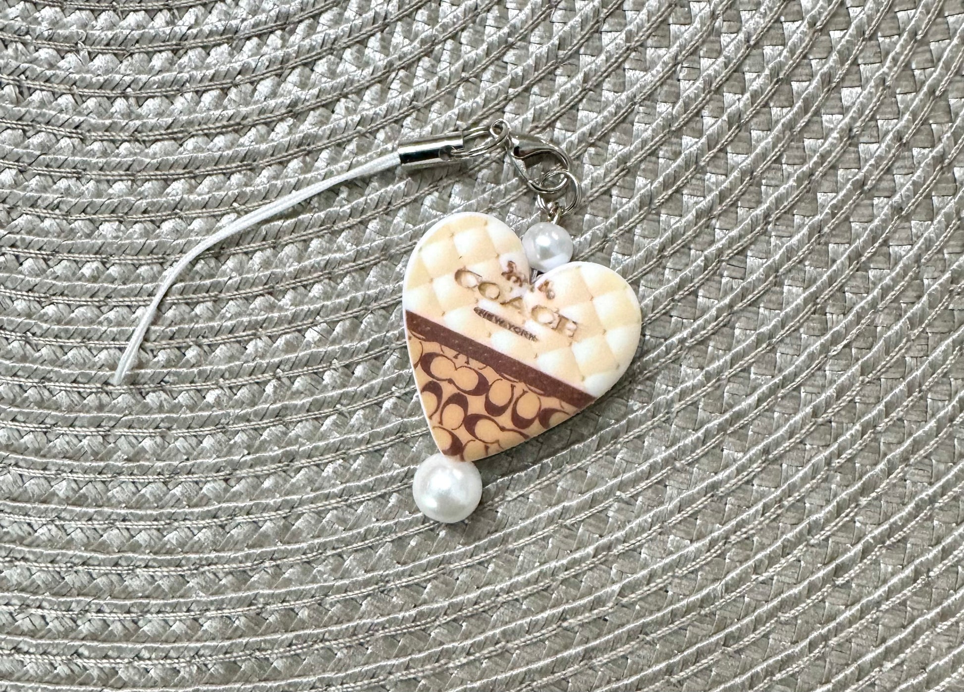 Cell phone charm on lanyard with lobster claw clasp.